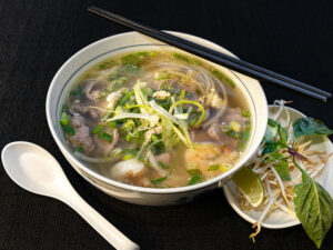 Pho stuffed in a burrito with linguine-shaped rice noodles, Thai basil, cilantro, bean sprouts, jalapeños & served with your choice of meats, with a bowl of broth.